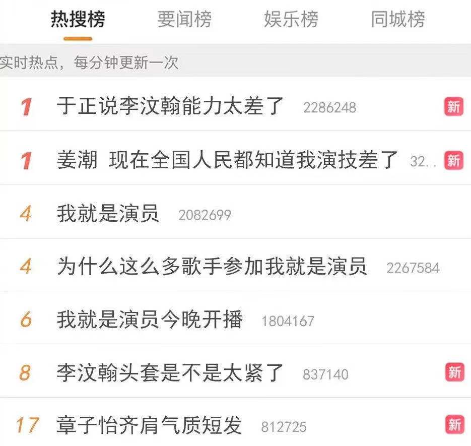 选秀、爱豆出身方面:2007《快乐男声》选秀冠军陈楚生、《青春有你2》成功出道的THE9成员谢可寅、第十一名金子涵;以及和王一博同属于UNIQ组合的李汶翰、时代少年团队长马嘉祺...... 歌手跨界方面:王霏霏、金莎、伊能静等“浪姐”们这次又踏浪而来;宋妍霏、姜潮和张超也是作为歌手,近期有热议角色或热播综艺...... 有话题度、需要流量的演员方面:两代“琼瑶女郎”陈德容和李晟、《太子妃升职记》的盛一伦、《斗鱼》的郭品超;以及小沈阳、包贝尔、刘孜等大家熟悉的老演员们...... 节目一经上线,首播至今的微博热搜上,关于“我就是演员”的相关话题仍然是强势霸榜:比如热搜TOP1的#于正说李汶翰能力太差了# #姜潮 现在全国人民都知道我演技差了#,热搜TOP4的#为什么这么多歌手参加我就是演员#等等。